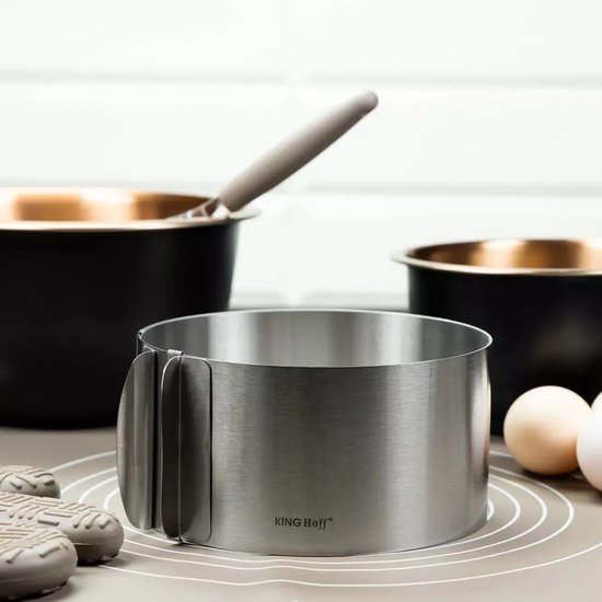 De Kinghoff Verstelbare Taartring (model KH4614) is een veelzijdige en hoogwaardige bakvorm voor elke thuisbakker. Met deze roestvrijstalen taartring kunt u eenvoudig taarten, cheesecakes, mousses en andere desserts maken in verschillende diameters, van 16 tot 30 cm. Dankzij het satijn afgewerkte oppervlak en het duurzame ontwerp is deze taartring een must-have voor zowel beginners als professionele bakliefhebbers.