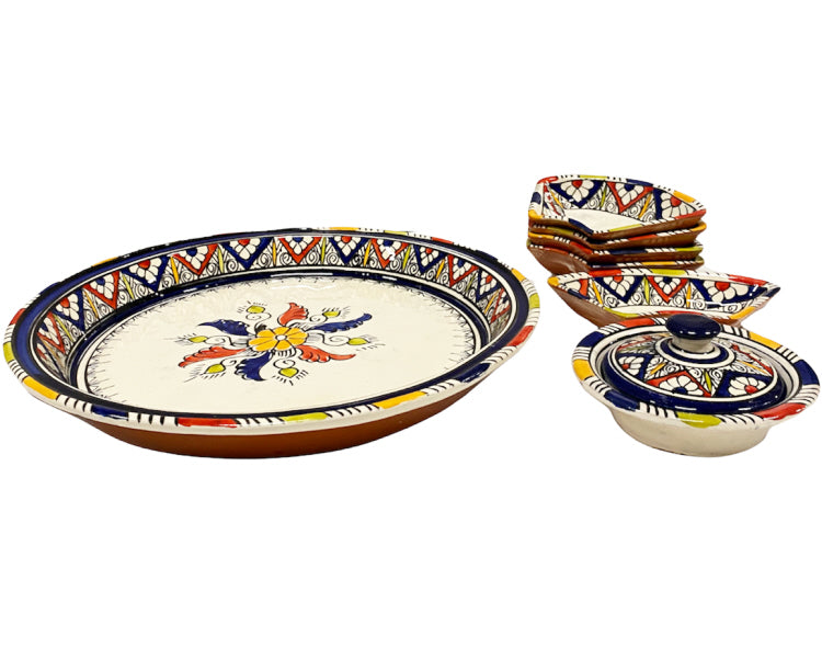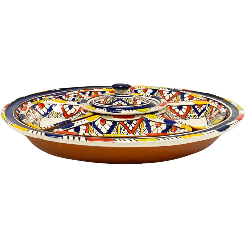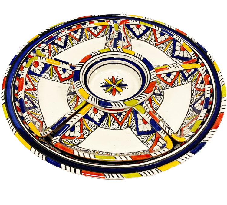 Handgemaakte en beschilderde Marokkaanse aardewerk tapasschaal met een vrolijke patronen. Deze prachtige tapas set bestaat uit een bord van 35cm,... Lees meer
