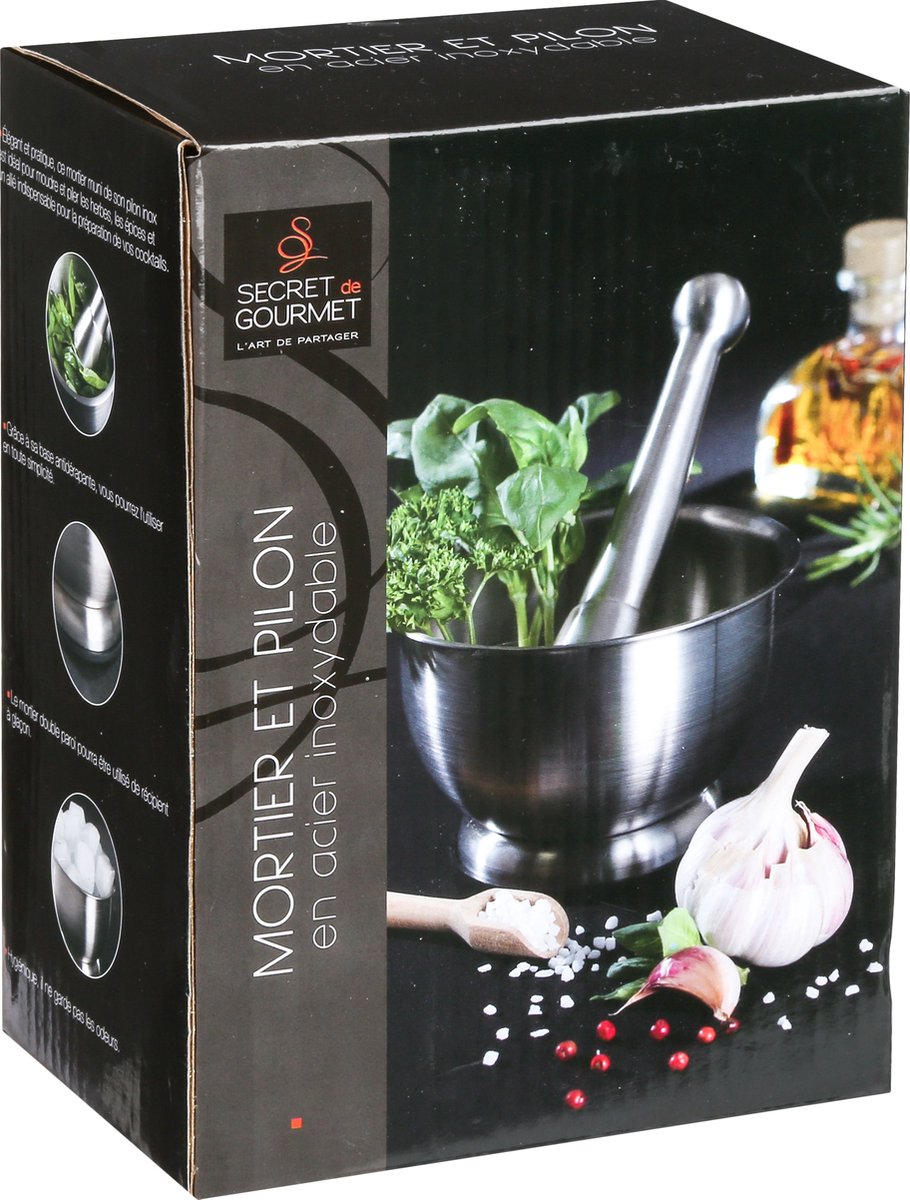 Vijzel met stamper D12 x H8 cm. De vijzel is ideaal voor het fijnmaken en malen van verse en gedroogde specerijen en kruiden en voor het maken van o.a. pasta's en pesto. Afmeting vijzel: ca. D12 x H8 cm. Afmeting stamper hoogte: ca. 17 cm. Materiaal: RVS. Reinigen: afwassen met de hand, niet geschikt voor de vaatwasser.