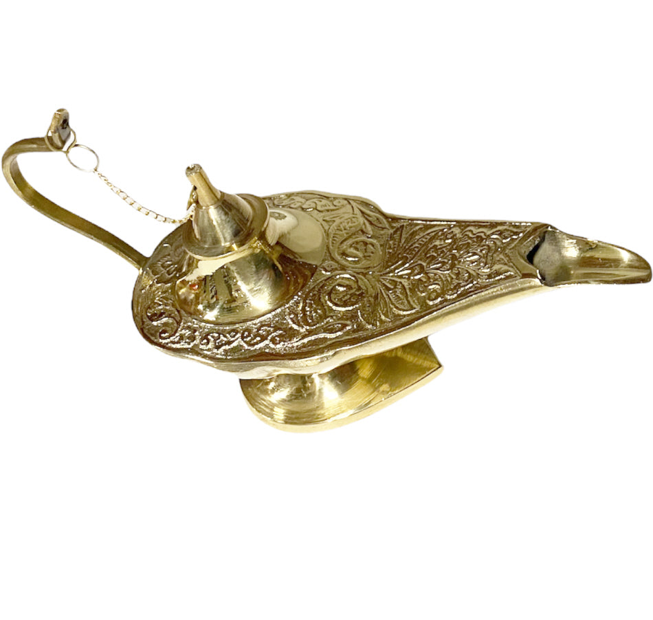 Handgemachte authentische goldfarbene Aladdin-Wunderlampe. Reiben Sie die Aladdin-Lampe und der Genie (Geist) kann herauskommen, äußern Sie einen Wunsch und der... Lesen Sie mehr