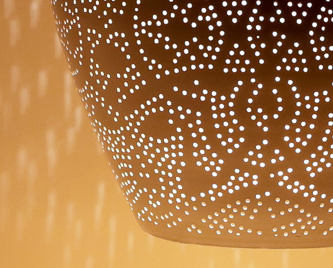 Oosterse filigrain hanglamp met een vaas vorm en een open onderkant die mooi bewerkt is met gaatjes patronen. De buitenkant... Lesen Sie mehr