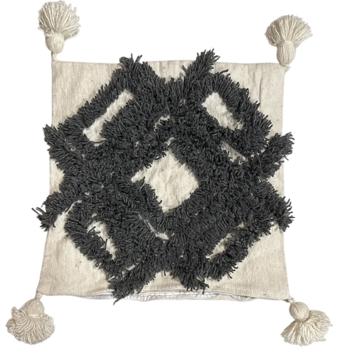 Dieser wunderschöne Kissenbezug verleiht Ihrem Wohnraum eine schöne Textur und Persönlichkeit, egal ob Sie ihn auf dem Sofa, dem Bett oder in einer Leseecke platzieren. Der cremeweiße, zu 100 % handgewebte Baumwollbezug ist mit flauschigen getufteten geometrischen Details und niedlichen Quasten an allen vier Ecken verziert, wodurch er perfekt in eine Boho- oder zeitgenössisch inspirierte Einrichtung passt.