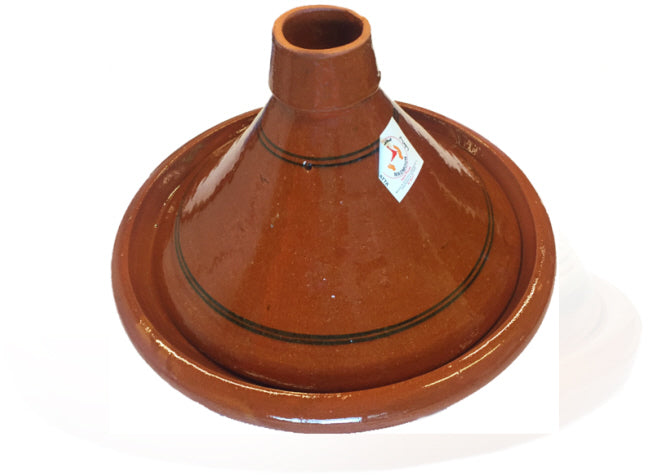Marokkanische Tajine, handgefertigt und aus Steingut. Durch den speziellen kegelförmigen Deckel tropft die verdampfte Flüssigkeit wieder auf die Zutaten zurück. Da bei der Zubereitung von Speisen in der Tajine nicht nur alle Säfte, sondern auch alle Aromen erhalten bleiben, ist es ein wahres Geruchserlebnis, die Tajine am Tisch im Beisein aller Esser zu öffnen!
