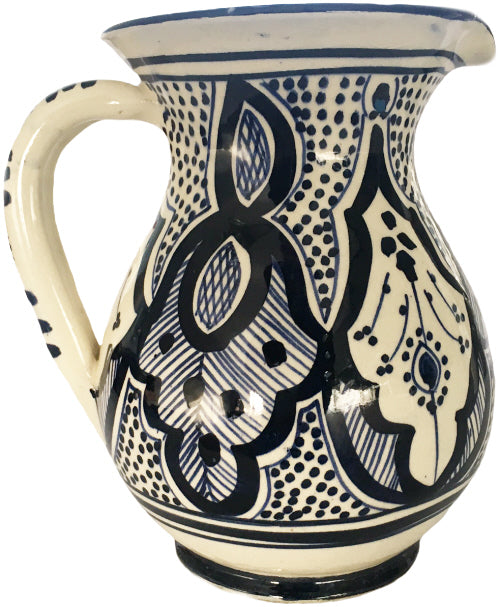 Schöner marokkanischer Wasserkrug, blau bemalt und aus glasierter Keramik. Handgefertigt im authentischen marokkanischen Stil. Höhe: 20 cm Fassungsvermögen: 1,7 l Lesen Sie mehr